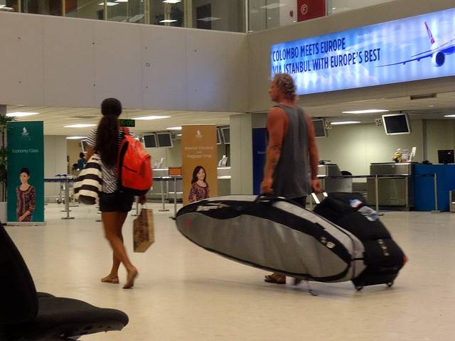 在机场候机厅看到有两对老外扛着巨大的冲浪板来斯里兰卡度假,皮肤颜色很健康,这样的度假是不是很牛呢?在办理登机牌时偶遇一个中国团队,在分装东西,行李摊了一地,那个吵啊!!!值班的女士面露不屑,我有点汗颜!