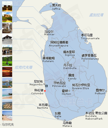 斯里兰卡原称锡兰,1972年改为现名。是印度洋中的一个岛国,与印度南部隔海相望,其间的保克海峡最窄处只有六十多公里。总面积6.5万平方公里,大约是我国海南岛的1.85倍。我们的飞机从岛的东岸到西岸只飞了二十分钟,距离应该在两百多公里吧。人口目前约两千万人。其中主要为僧伽罗人,少数泰米尔人和土著人。约70%的人信奉佛教。从公元十六世纪起先后被葡萄牙人及荷兰人统治,十八世纪起成为英国的殖民地,1948年独立,现为英联邦成员。