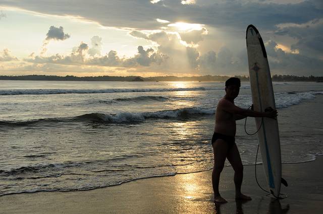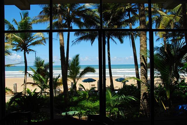 酒足饭饱回去睡觉,起来后我们出来买水果和水,在酒店门口走了一截都没商店,想着明天要去加勒又担心没有公车,就打听了突突车司机,尽管喊出天价但还是留了他电话作为储备。坐他的突突车300RS去街上买水果,然后下水游泳消饱胀,租冲浪板300RS/小时,晚饭就点了份炒饭合着吃,午饭吃太晚了。晚饭后在大厅吹海风听海涛吃水果看攻略,好不惬意……