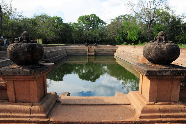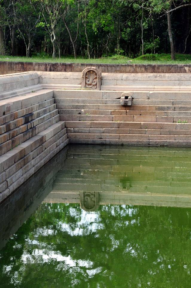 萨马迪坐佛佛像的东面是这个双池塘,这是阿努拉德普勒最精美的浴池,无畏山舍利塔寺庙里的僧人曾经使用过的。水流从北边池塘的"Makara"(传说中结合多种生物特点的一种野兽)嘴里流入,而后经一根地下管道再流入比较小的那座池塘里。离“Makara”很近的那5头眼镜蛇形象十分精美,池塘西北部有水净化系统。