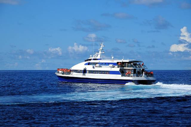 观鲸的船大都在这个时候出海,海面上散落着大大小小的船只。通常在住宿的地方都可以代安排各种出海游;观鲸看运气,出海2至6小时不等。今天阳光明媚,越往里走海水越蓝