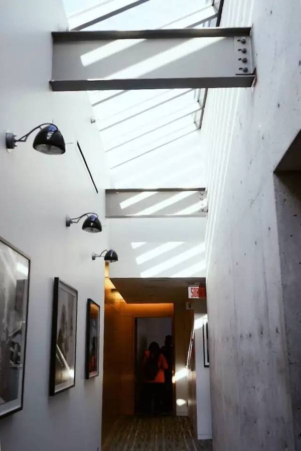 乘坐电梯来到位于4楼的房间外,由于已经触到玻璃顶层,光线非常明亮。走廊墙面上继续是同一位蒙特利尔摄影师的作品,原始却光滑的墙壁让花花一下子野性了起来。