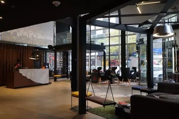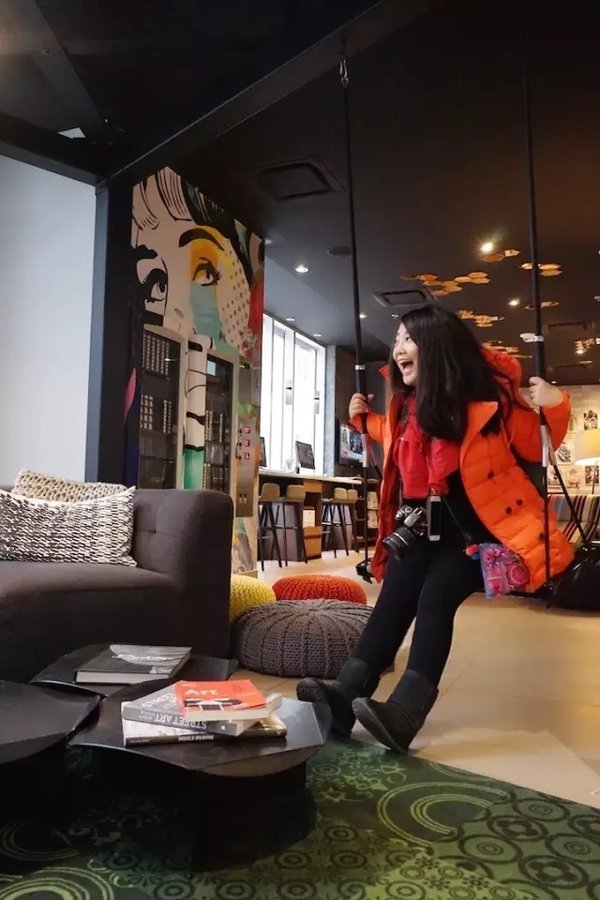 大堂的设计错落有致,工业之余还流露出一种童趣味。例如休息区都是很“抓马”的大沙发、单人椅,或者甚至是秋千!而在接待处旁边的高台上,每个周末都是DJ现场打碟!让客人随时放松,随时开趴!