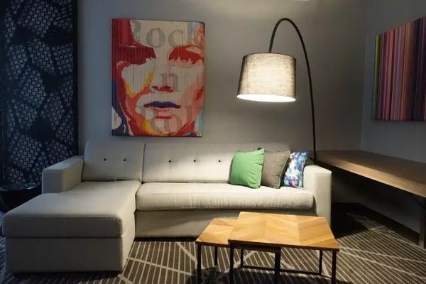 来看客房!彩色艺术作品和白色沙发配得刚刚好。