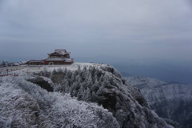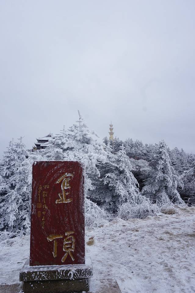 从接引殿乘缆车到金顶,金顶上到不没有下雪,但是雪霁天晴,仿佛是北国风光~~太美了!!南方孩子内心狂喜乱舞!!不过风雪天金顶上很冷,装备全部穿起来!!十方普贤在大雾中看,是马赛克版的==+