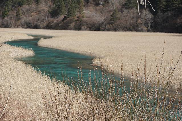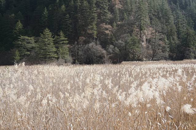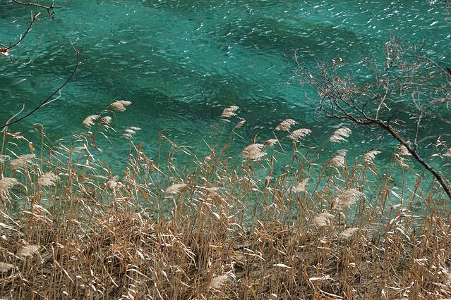 从火花海再往前走,就能看到成片金黄芦苇的芦苇海了!蓝色飘带般的海子从芦苇丛之间穿过,几只野鸭游荡在湖面之上,山风吹过,想起清脆的飒飒声,如世外桃源。这次来九寨的目的之一,就是想来看芦苇海,结果不负众望!!太值得了!!