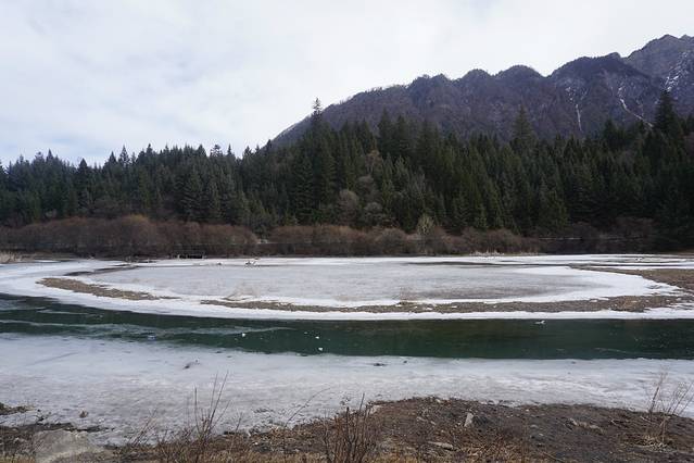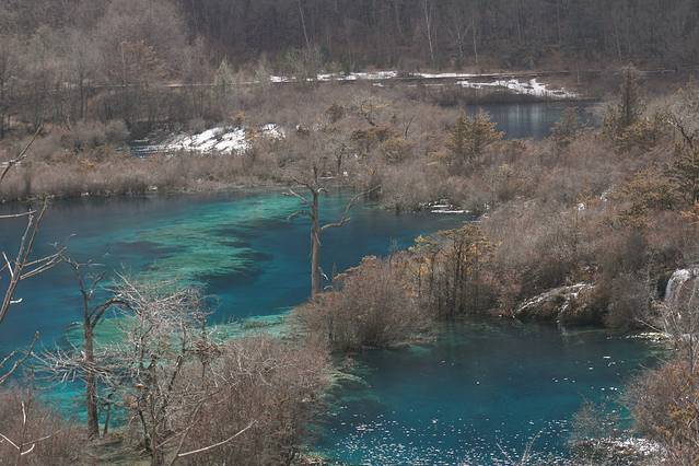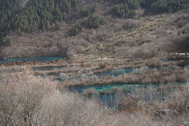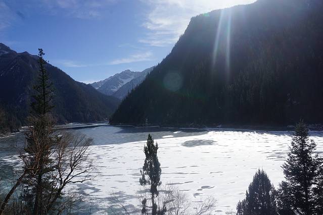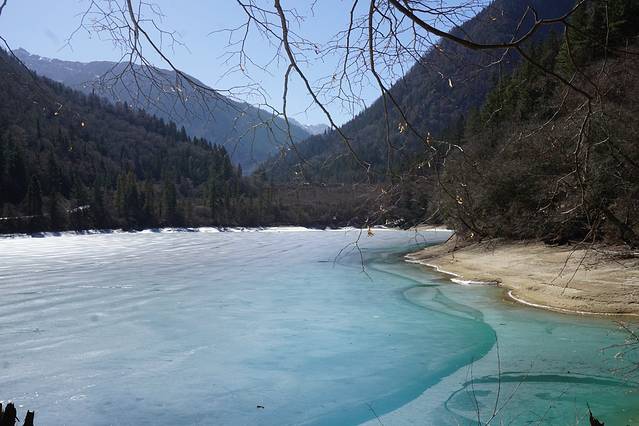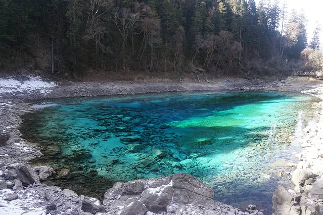 看完珍珠滩后,走到换乘站,坐车直上左支。长海完全结冰,下面的栈道也是被封掉的,所以只能俯瞰整个长海,但是也足够展现海子的美了~五彩池水不多,像一颗蓝宝石嵌在山谷之中。