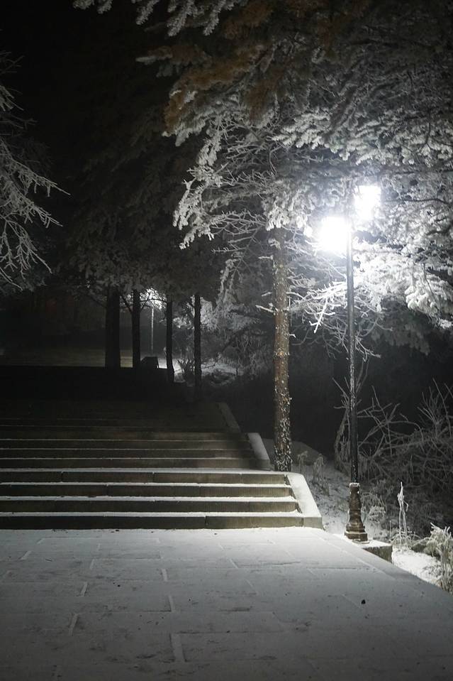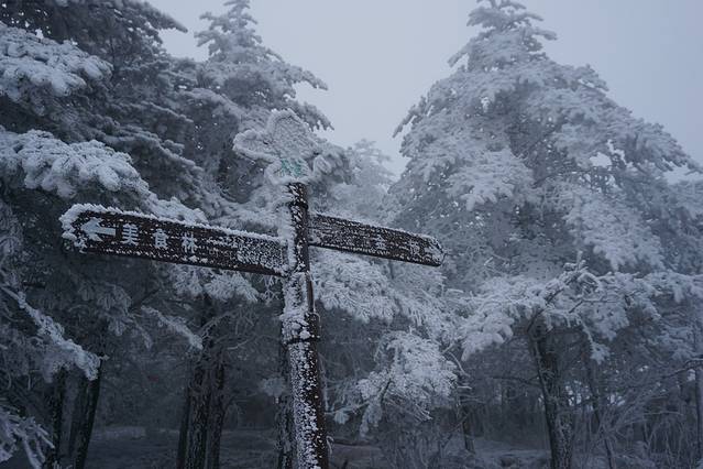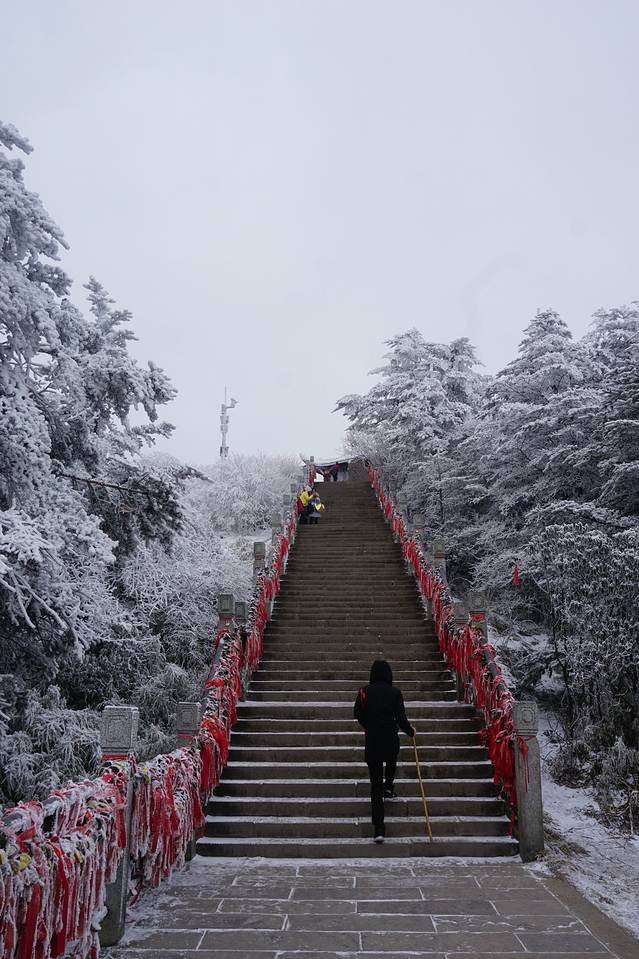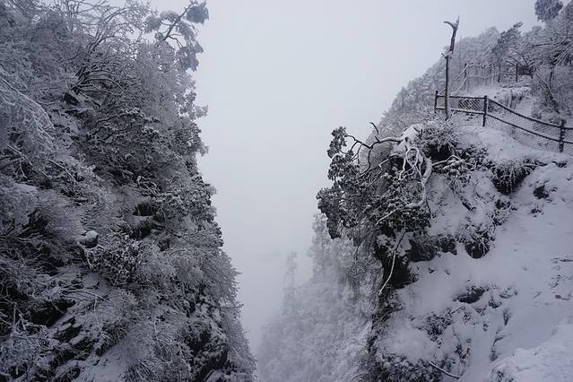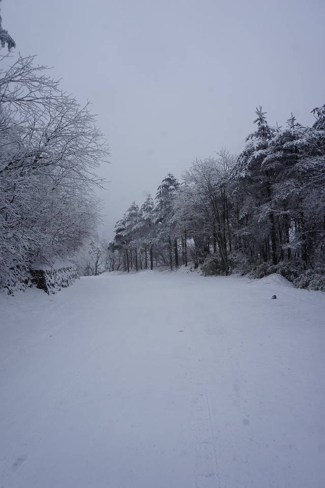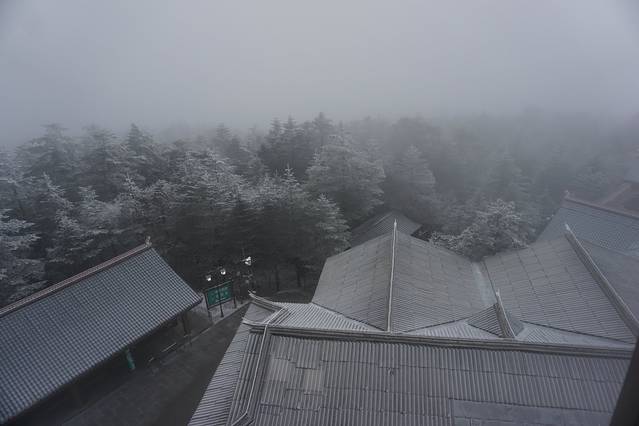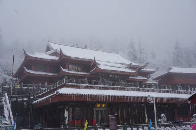 从报国寺客运中心到雷洞坪,大概需要2h的车程,越往上走可以看到从雨变成了雪!!我们很幸运的遇到了峨眉山立春之后的第一场雪~但是相应的日出估计是悬了。爬过很多山的我感觉,如果峨眉山没有这美如仙境的雪景,我会遗憾来这里吧。山、雪、寺庙、雾,一切的一切都是如此纯粹。边走在雪地路上,脑子里浮现出一首bgm——东山花路灯。