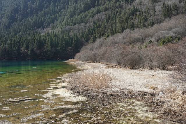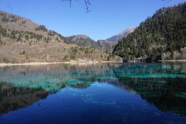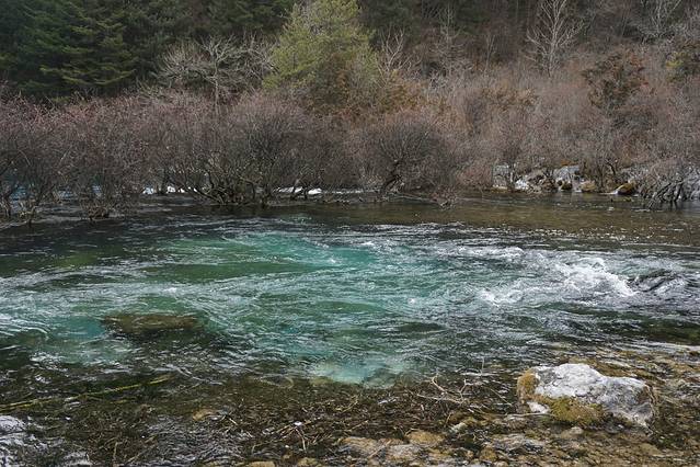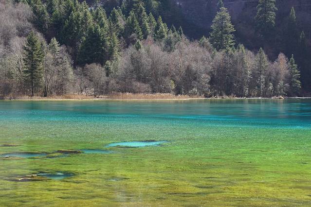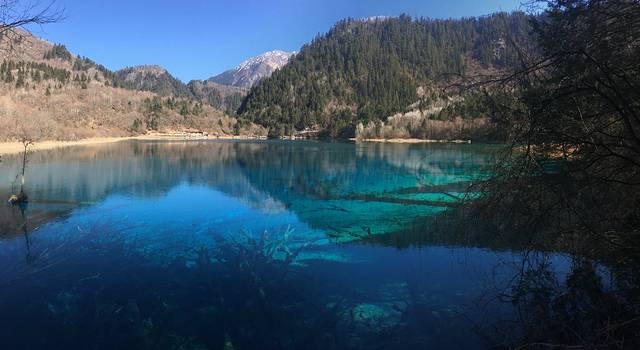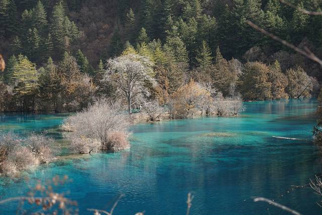 九寨沟的水在冬天纯净到了极致。由于山林草木都是黄色系,水的颜色才得以完全展现。每个海子都能引起我们的一阵感叹:太美了!水的蓝色各不相同,冬天还能看到冰水相融。树木虽然没有像秋天时那样炫彩斑斓,但是也充满了层次感,绝不会感到萧瑟乏味。