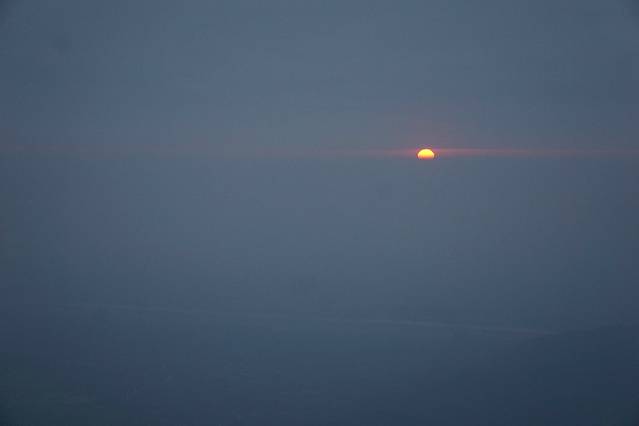 7点50分日出,站好位,等到太阳的露面。天公对我们还是有怜悯之心的,让我们看到一轮红日升起!但是,由于云层太厚,升起的太阳又躲入云层之中,我们没有看到光芒万丈,没有看到云海,内心还是有点失望的。但是,旅行总有遗憾,不然就不会有下一次的故地重游吧。