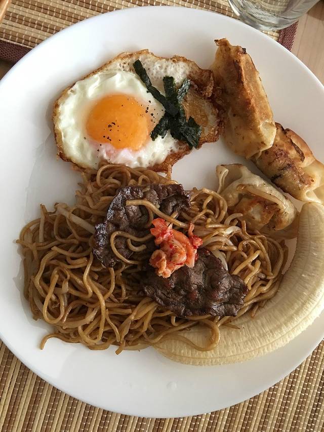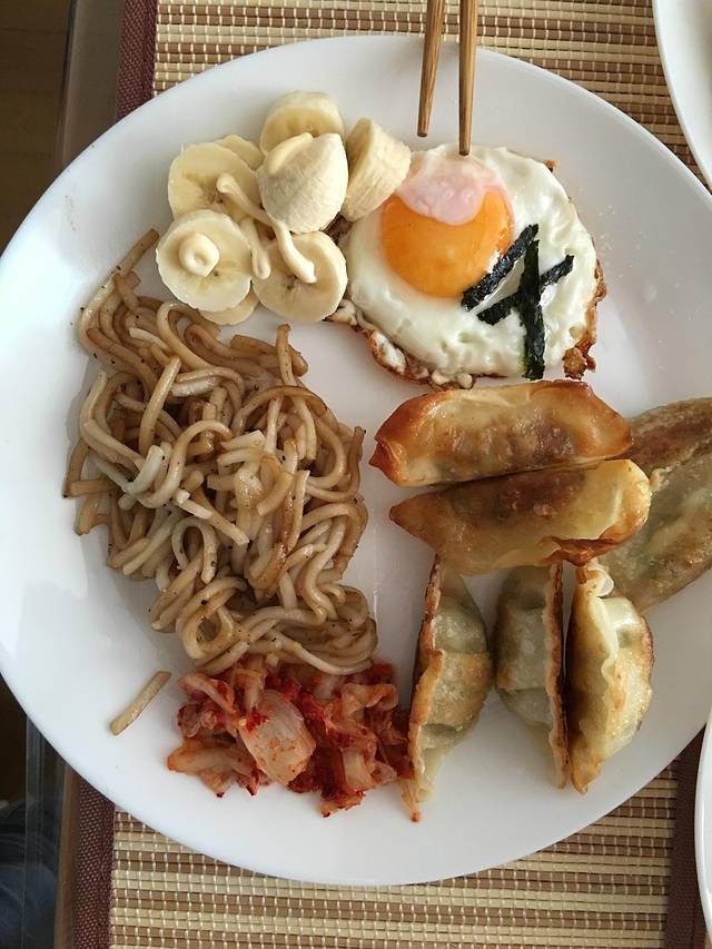 今天是最轻松的一天,快回国了,可以买点想买的东西,早上也不用急着出门,于是前一天晚上到超市买了鸡蛋、牛奶、面条、豆腐制品、饺子、香蕉等。忙碌一阵后,一顿丰盛的早餐就出锅了。