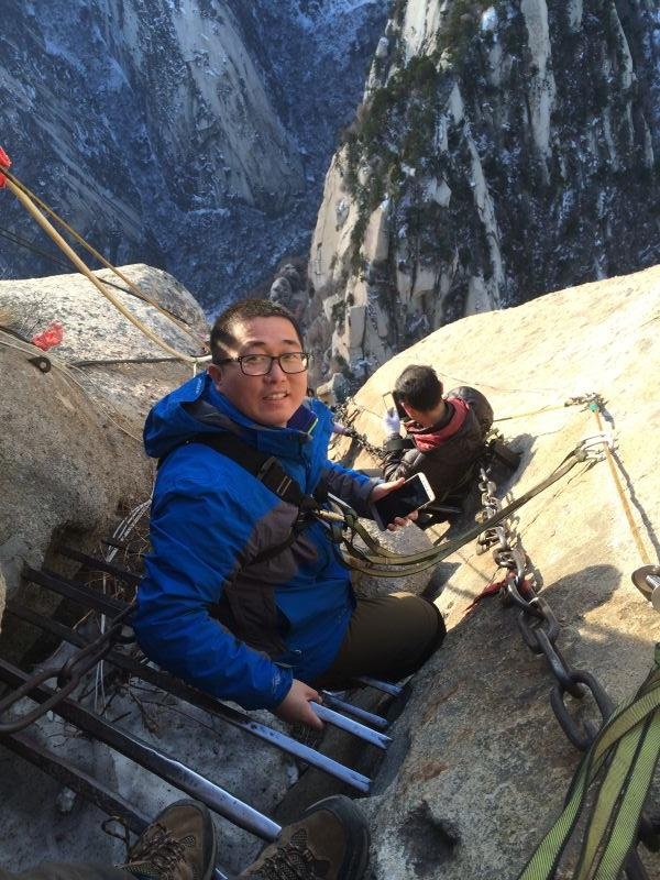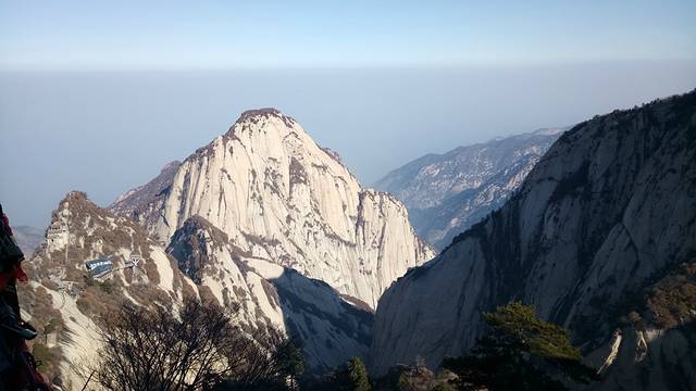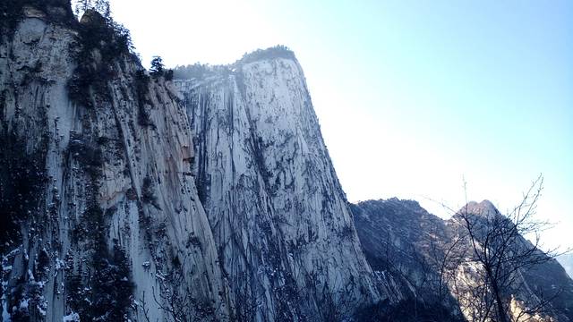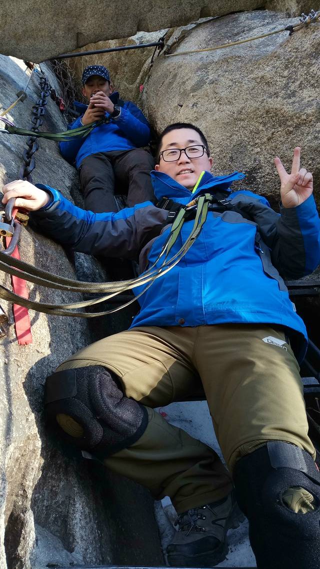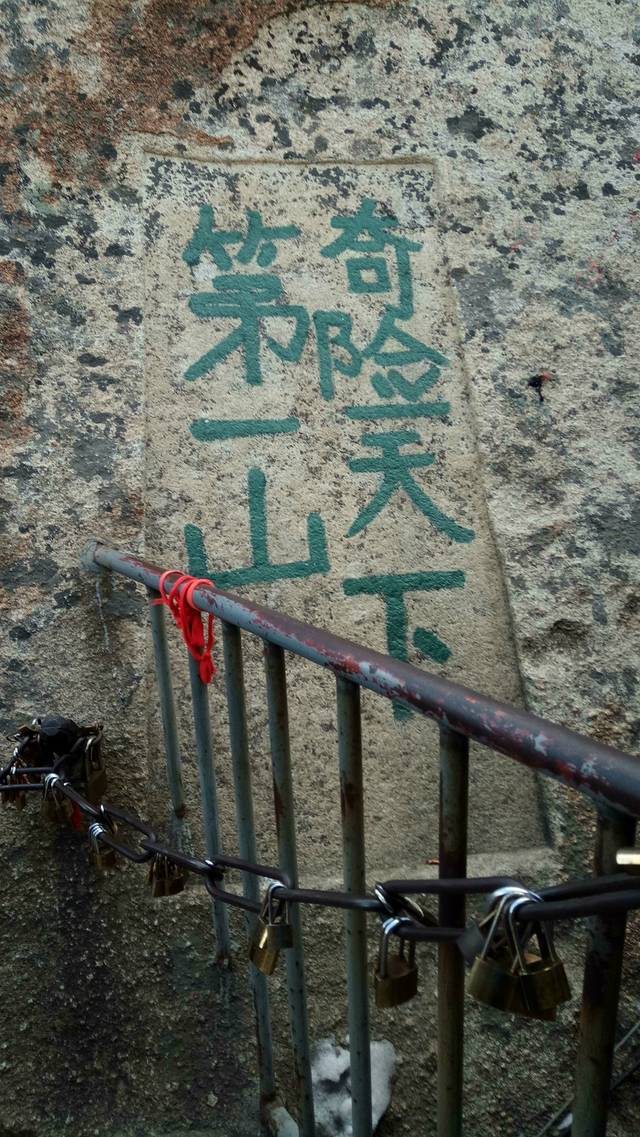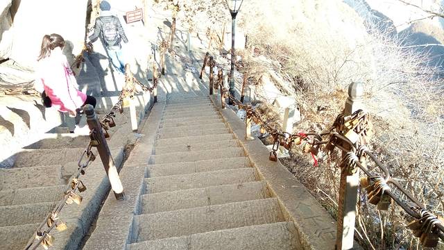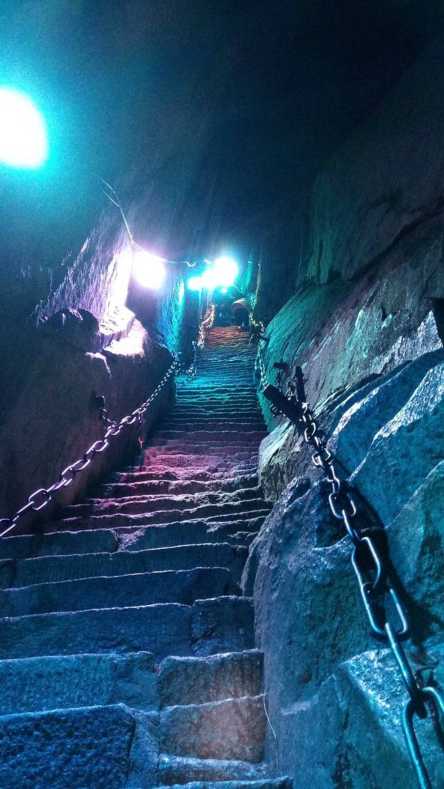 先来介绍下自古华山一条路上山的三段路。第一段是山底到北峰,直线距离约3.3公里,全程3999级台阶,山路大半超过50度倾斜,有三段几乎等同90度,用时大概四个小时。最刺激的是千尺幢和百尺峡两个地方。千尺幢是峭壁中的一条狭窄石缝,只有一半脚宽的台阶,只能通过一个人,而且高达十层楼落差,得拉着旁边的铁链才能慢慢一点一点往上爬。百尺峡是在90度绝壁上的91级石阶,主要特点就是陡。接下来是老君犁沟,与前两者异曲同工,当地人说『千尺幢,百尺峡,老君犁沟往上爬』,在这里再牛的运动员也只能做爬行动物。北峰上面的茶馆还有免费的热水暖气wifi和充电插座提供。如果打算在金锁关看日出的话,晚上三点左右到这里可以休息个把钟头,四点左右再出发就可以了。