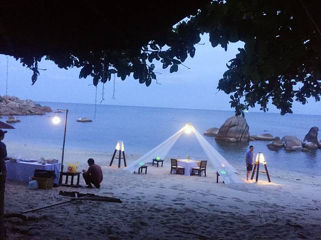 回到酒店,我们决定去酒店逛逛,一逛不知道,逛了以后吓一跳,原来酒店的私人沙滩超棒,我们去的大的那个,沙滩旁有很多免费的体验活动、以及设施设备,包括浮潜、香蕉船、泰拳这些都有。但是时间很晚了,我们准备明天来玩。工作人员正在准备唯一的一桌沙滩烛光晚餐,超级美!应该是谁订的蜜月特餐吧!