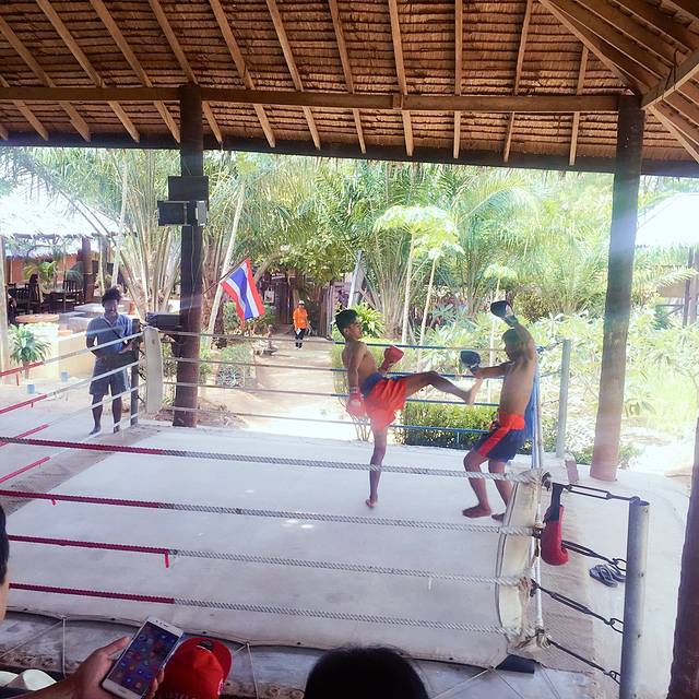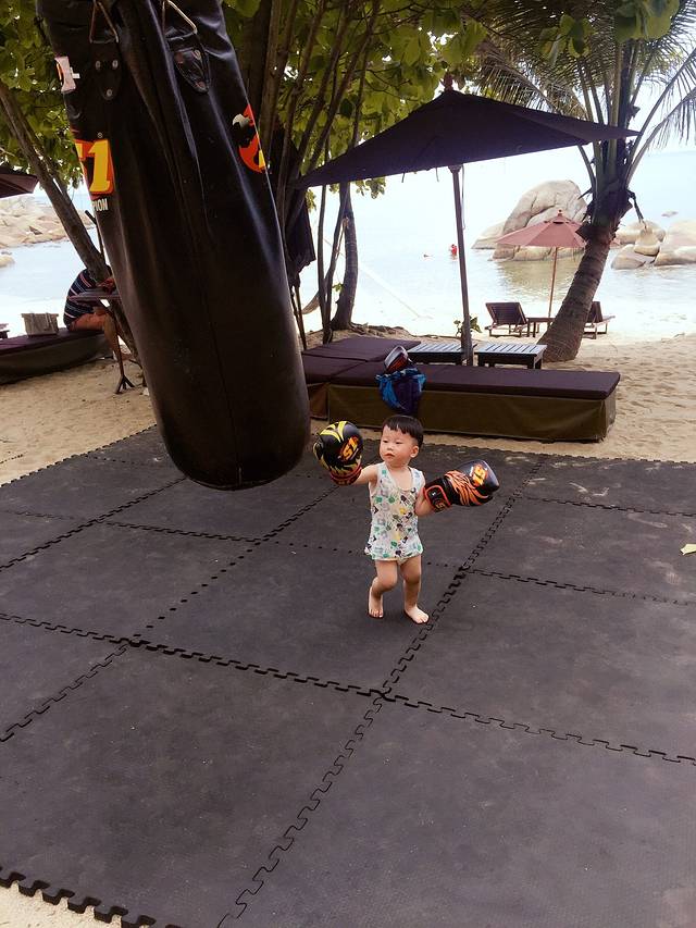 3、泰拳体验,去的时候酒店一个会泰拳的服务人员正在教一个游客玩泰拳。别人体验完后,我们也去体验了一把,宸哥真是什么都不拉下