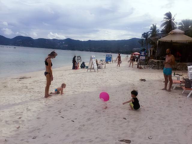 第一天,下午三点四十五从成都飞往苏梅岛,到达时间是六点四十五,刚好三个小时,(正是因为考虑苏梅有直飞,才决定带着宸哥一起去,虽然机票贵了些,也比飞去素叻他尼,再坐车船联运上岛快、舒适,但是如果你有足够的时间、想节约一些钱,带着大一些的宝贝,你也可以选择不直飞),到了苏梅岛机场后本以为我们提前办好了签证,可以很快的通关,结果很让人无语的事情发生了,办理人员都是老年人,速度都很慢,办理窗口就开了两个,其它窗口说是开的“VIP”,一名服务人员举着一个大牌了,上面写着多少泰铢全套服务,多少我记不住了,然后给了全套服务钱的亲就可以理直气壮的不用排队,走“VIP”窗口。