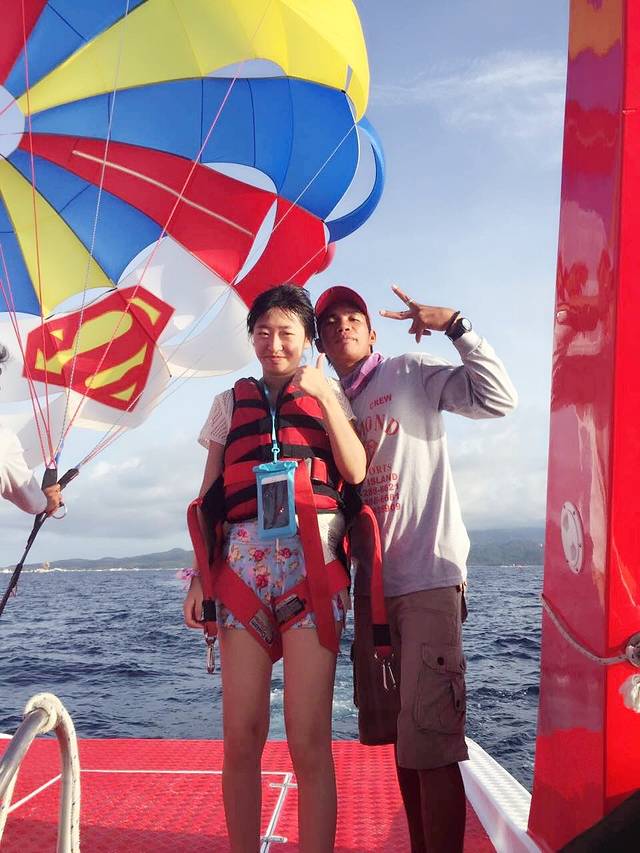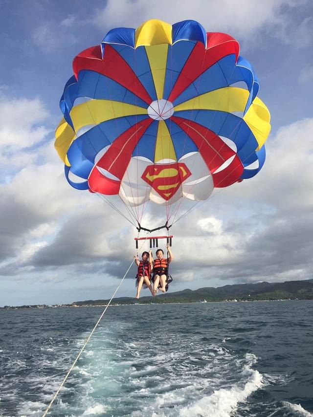 降落伞+香蕉船是在导游那定的,一个人2000p,统一集合坐快艇出海到一个大船上,先玩的香蕉船,我觉得很刺激,好多人坐在上面,前面快艇带起来浪大很好玩,胳膊得很使劲的抓着绳,要不真的会甩海里大概二十分钟。