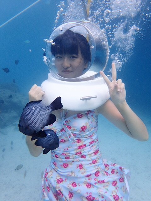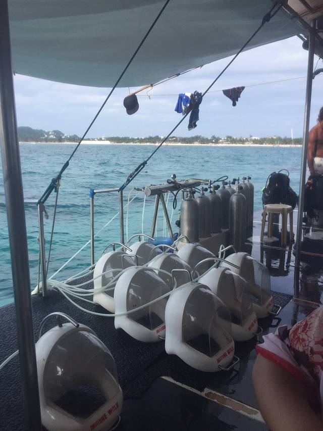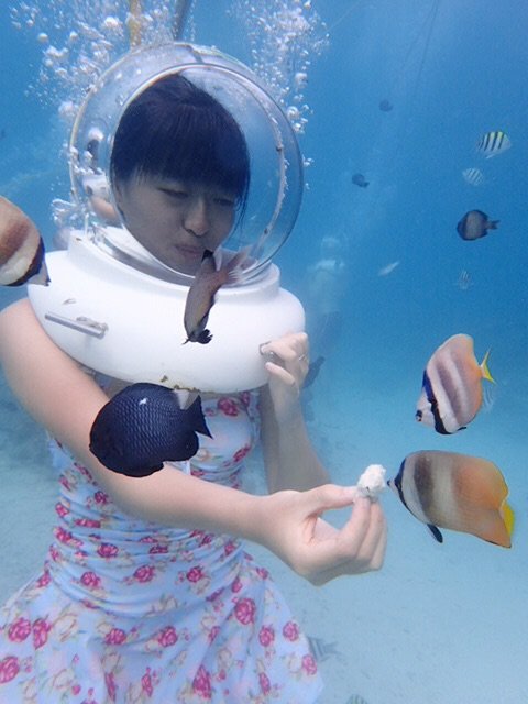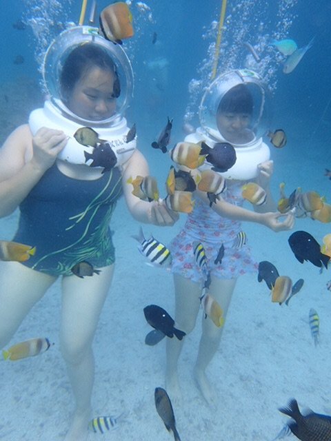 海底漫步之前有些小紧张,但是完全没事哦,非常棒,很惊喜,在下去之前工作人员会给你讲一些注意事项,一个是提醒在水下不要游泳,保持站立姿势,还有就是水下耳朵压力,两个方法一个是咽口水,一个是手捏住鼻子👃🏻往外喷气可以立刻打通耳膜,很管用,这个头盔非常沉,不过在水里就没事啦,头完全不会挨到水,头盔里打上氧气,非常自如,在水里会有人给你面包🍞,好多小鱼就游过来啦,会有人给你拍照,等上岸刻成盘给你,价格包含在一起的,海底漫步是在海边跟小贩砍价的,最后1200P两个人成交。还算可以吧,一定要狠砍哦,决不让步,一定可以!