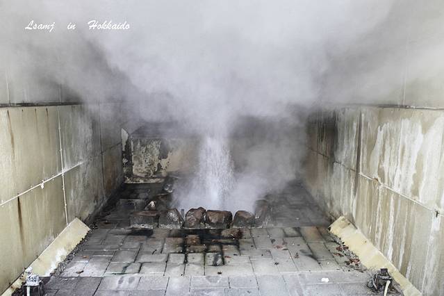 温泉街的尽头有一个天然的温泉眼,每隔4个小时就要喷一次温泉。我们到的时候,正赶上泉眼喷水,大量的温泉水伴着浓浓的白烟和硫磺味冲了出来。