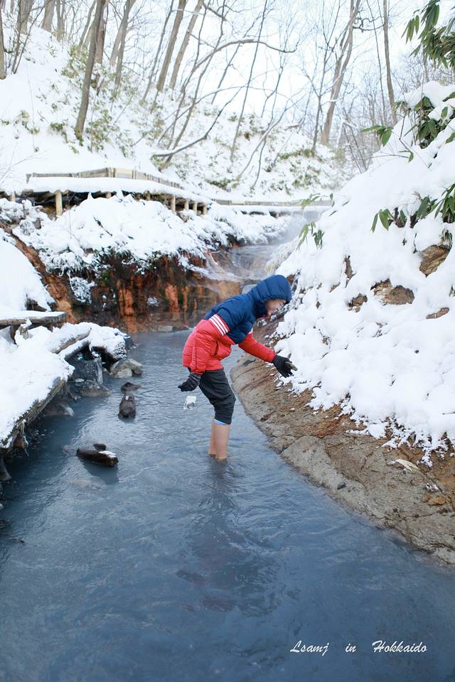 我们到达的时候,也有很多人聚集在温泉流后方泡足汤。我们也直接找块干净点的石头,用手简单扫扫雪,坐下来就开始脱鞋。脱下鞋才发现,袜子都湿了,于是赶紧把冻得麻木的脚丫伸进了温泉水里。