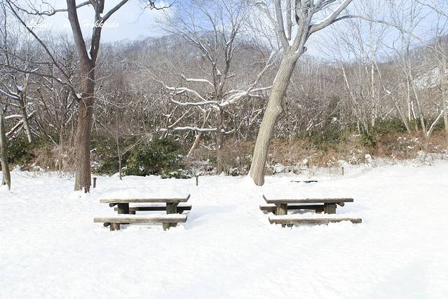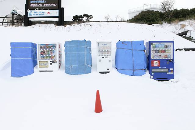 地球岬真的是一个没什么人的绝妙观景台,大雪把椅子都埋了个遍,这里的自动贩卖机也有好几台被关了。弟弟想要去最中间的自动贩卖机买牛奶,可是无奈雪太厚,怎么也过不去,最后只有在最右边的机器里买了瓶果汁。