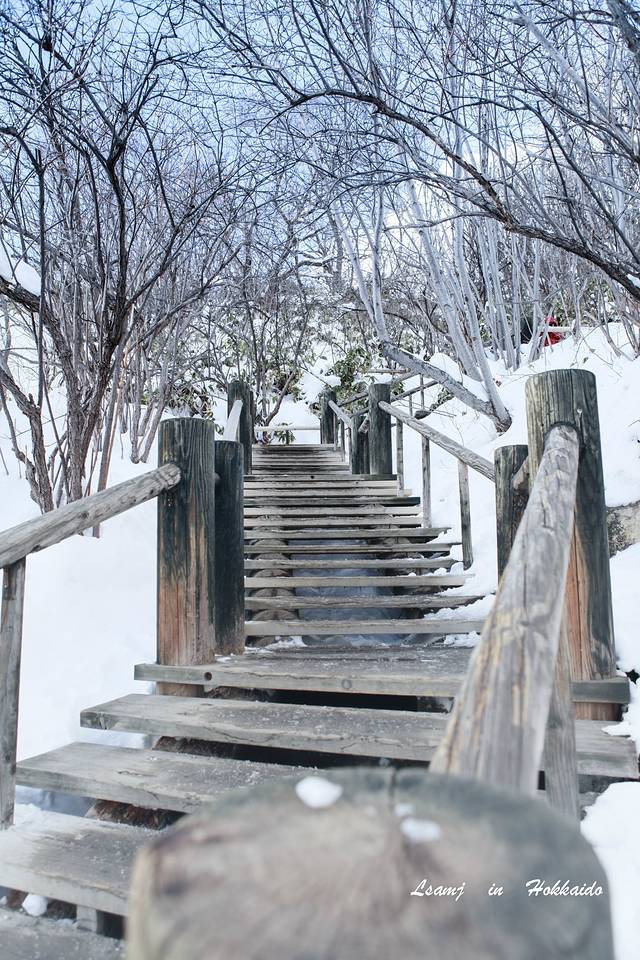 地狱谷的开发是很完善的,本来这一条路都铺满了石阶。可是因为积雪,所有的石阶都被大雪填平,变成了坡。标志上写的20分钟的路程,活生生得被我们走成了2小时+。妈妈因为腿不好,放弃了和我们一起去找足汤。好在我妈总是很会给自己找乐子,所以这次旅途中,虽然有好几次她因为腿脚原因不能跟我们一起前行。她都能在原地自娱自乐,玩得也是相当开心。