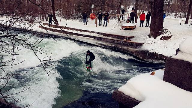 本以为大冬天不会有冲浪的,没想刚到那就看到一群围观的,这次冲浪的居然有几个女生看着还挺壮实而且冲得还很酷炫。真正的勇士敢于直冲冰冷的河水。