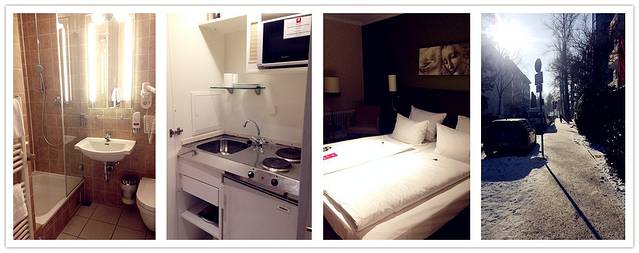 第一步当然是直奔酒店放行李…先。慕尼黑订的这家酒店算是此次行程最贵之二的一间,不过价钱也只有60欧一晚(当然,订的是comfort这种最便宜的款)还是完全可接受的。在agoda上订的,因为比booking便宜一些,虽然一般会优先上booking订。酒店虽然不能步行到玛莉安广场,但离地铁站只有不到5分钟路程,离老城区也只有3-4站,所以非常方便。房间不算大,但还内置了一个小厨房也是够惊喜的—虽然我俩除了泡开水其它也没用过(刚好碰上周日也没啥可买的)。
