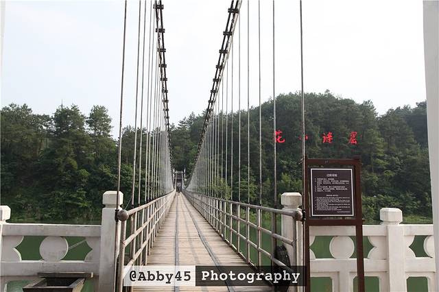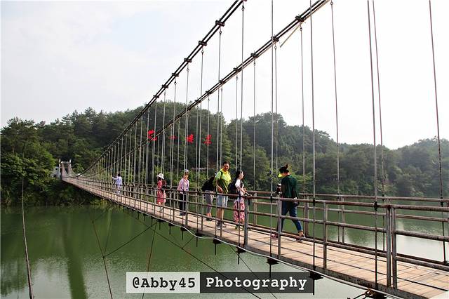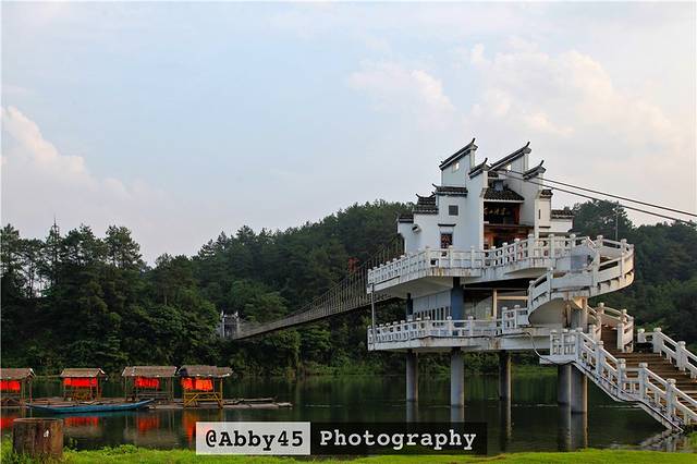 跨江而立的桥头堡依照徽派建筑风格建造,是通往景区的必经之桥,全长130米,宽1.8米,可同时容纳300人在桥面上行走。