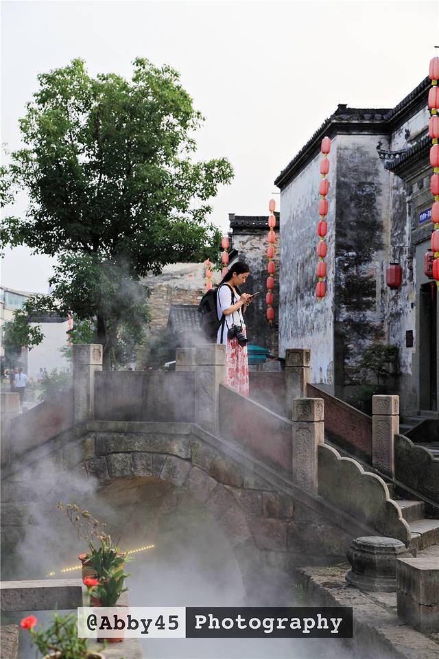 从花山谜窟重返黎阳in巷之后,我和小伙伴们开始寻觅徽州美食了。白天的小桥因为有水雾平添了一丝仙境。小伙伴就像仙女一样站在桥上。