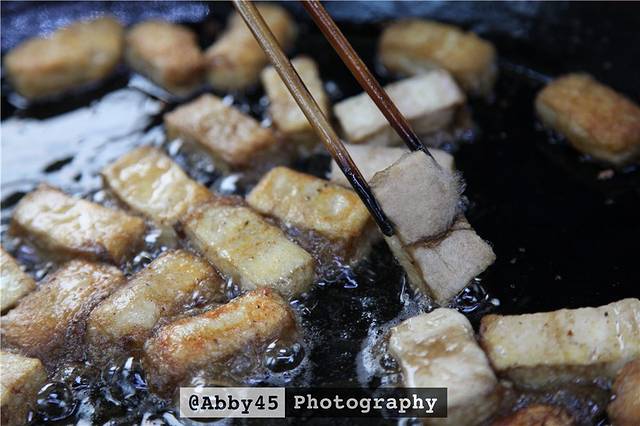 传说毛豆腐还与朱元璋有关。朱元璋一次兵败徽州,逃至休宁一带,腹中饥饿难熬,一随从从草堆中搜寻出逃难百姓藏着但已发酵长毛的豆腐,放在炭火上烤熟给朱元璋吃。不料豆腐味道十分鲜美,朱元璋吃了非常高兴,转败为胜,毛豆腐得以广为流传。故事真假与否不知,但油煎过后的毛豆腐真的很好吃,我居然吃出拔丝的效果,豆腐相当鲜嫩。