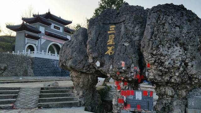 三星岩又名三棒岩,兀立于凤城镇北门外一华里的紫云桥畔,朗江之滨,由数十吨重的三块艺巨石并足鼎立,居中一石镌刻“三星岩”而名。