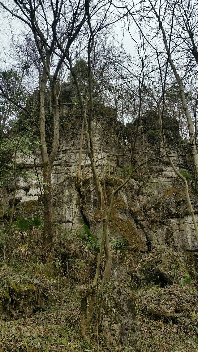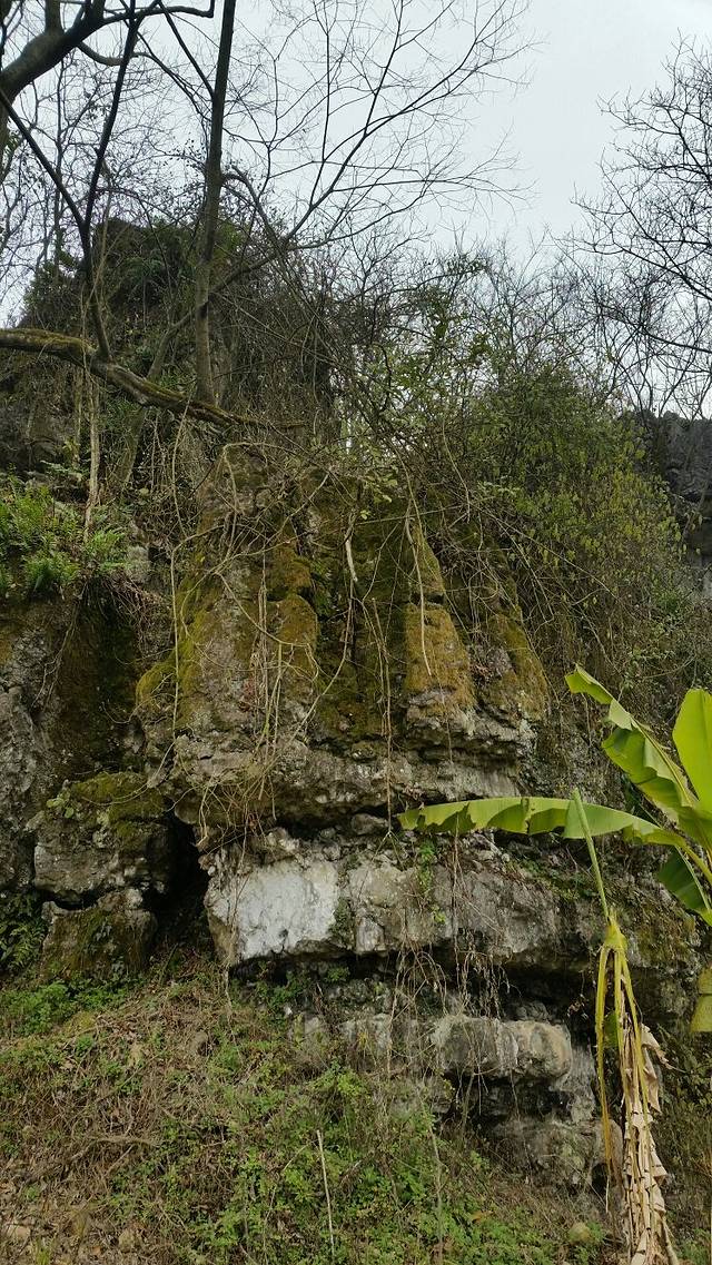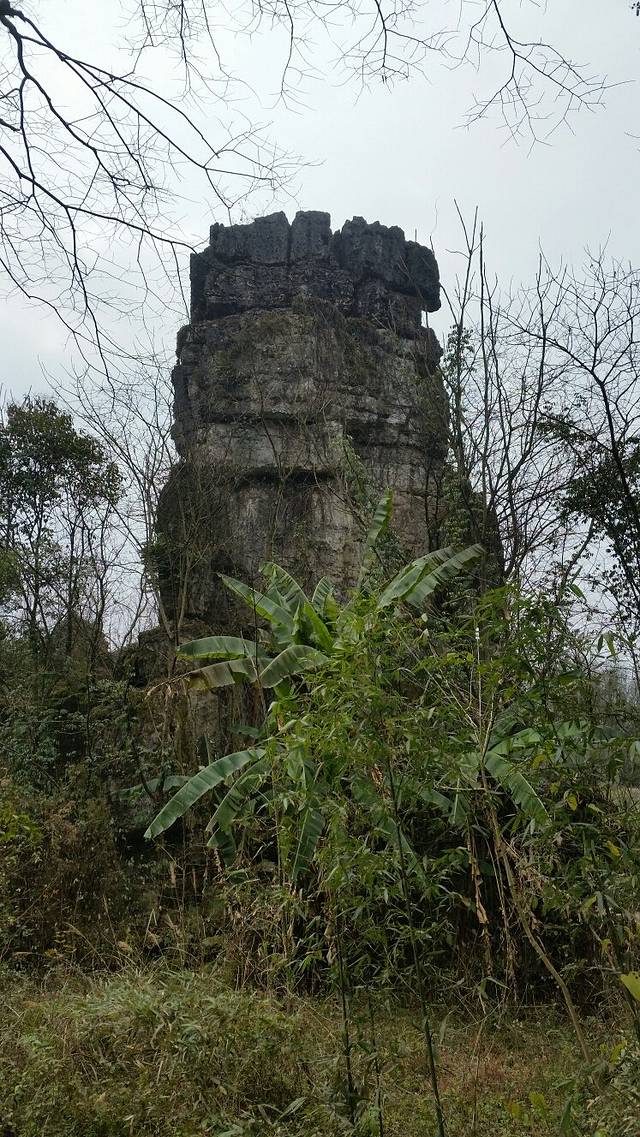 石柱岩周围石笋林立,顶上石块状如椅子,柱身呈海花状纹彩,石缝中草木藤葛丛生,石柱岩的南侧有一块倾斜的大岩石,从这块大岩石的顶端可以攀援到石柱岩的下半腰,然后借助经长年累月风雨侵蚀而形成的疙瘩和小坑洼,可以攀援到石柱岩的岩顶。