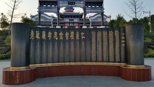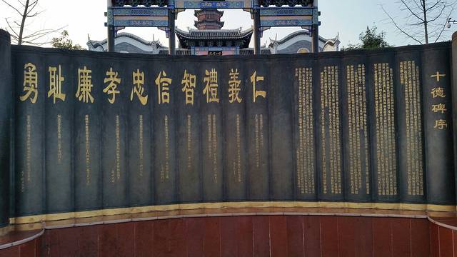 铜像后面竖一铜质碑,曰“十德碑”,碑体呈竹简状,高2.6米,系天柱县教育局捐赠。碑左镌铭“仁、义、礼、智、信、忠、孝、廉、耻、勇”十德要义;碑右镌铭“十德碑序”, 该序由贵州大学张新民教授撰写,谆谆教化,催人奋进。
