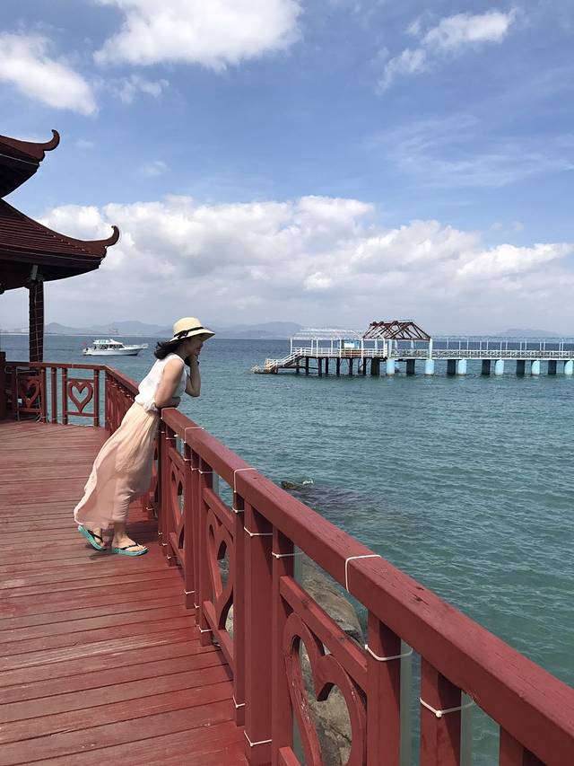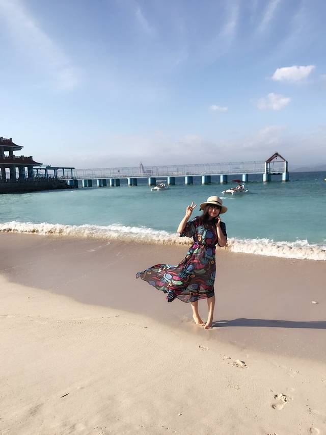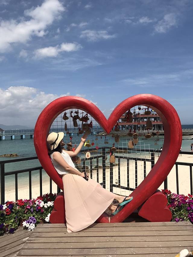 拍照到快十一点结束,赶快回房间收拾行李退房,12:15分,刚办好退房手续,蜈支洲岛珊瑚酒店的大巴车就到了大堂门口等候了,上了大巴车又去别的酒店接了四位客人,到达码头已经快两点了。码头有珊瑚酒店的客人专用VIP通道,不需要跟一日游的游客一起排队,可以优先上岛,而且船门票是包含在房费里的。办好入住,我们一行人终于坐上了开往蜈支洲岛的船,大船在海上左右摇摆了近20分钟终于到达蜈支洲岛。下了船上岸后也有酒店的电瓶车在等待把住店的客人直接送到酒店大堂,但大堂拿了房卡把行李放到房间,换了一身长裙子,已经是下午四点半了,招呼着同行的伙伴一起顺着酒店的后门走出去,路上的人和沙滩上的人就开始慢慢的少了,因为五点半以后一日游的客人都下岛了,岛上只剩下住在酒店的客人了,瞬间有种自己承包了这个岛的感觉~清净的街道,安静的沙滩,那淡蓝色的大海都是属于我们的啦~~那么接下来要做的事情就是拍照啦!从沙滩的各种Love Happy的造型一直拍到私人订制拍摄地。然后一直想着晚餐怎么解决,路上问了一份面要40块钱,果断放弃,结果拍完照走回酒店这群人被酒店的户外烧烤自助给吸引了,258元一位也都豪爽的吃了起来。三个家庭边吃边喝边聊,吃完已经晚上九点了,溜达回房间,洗漱一下,睡觉~