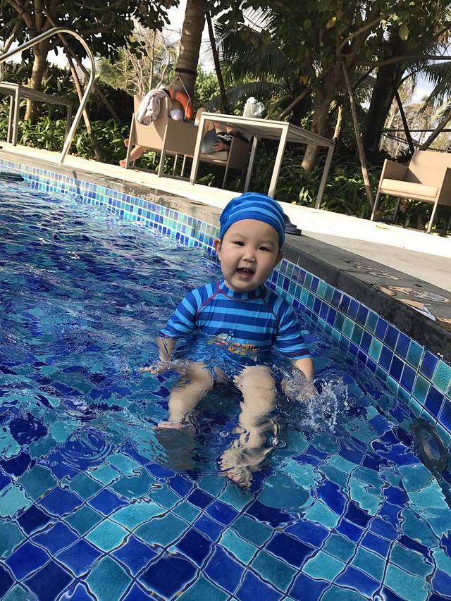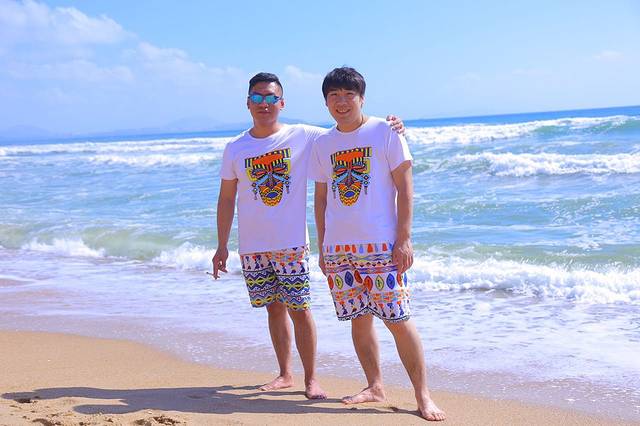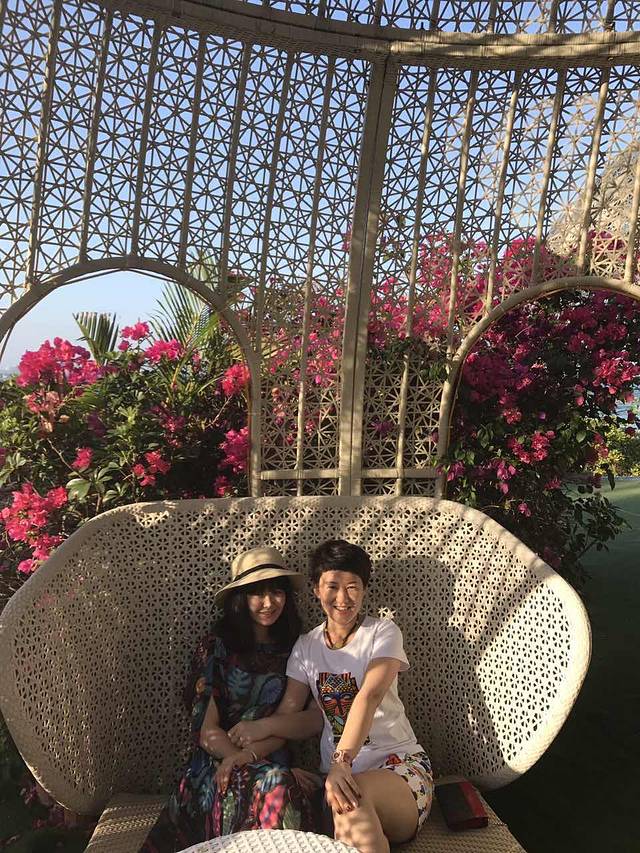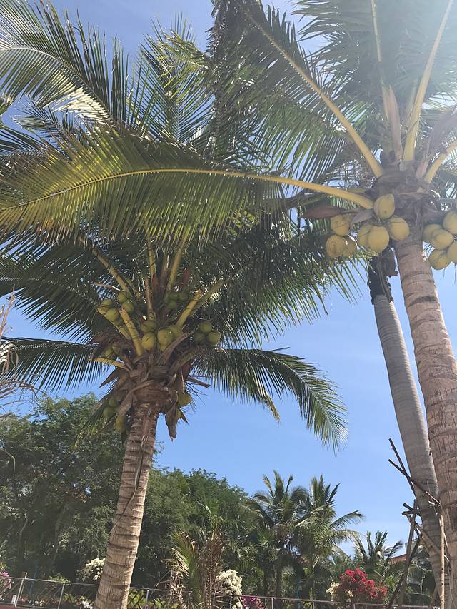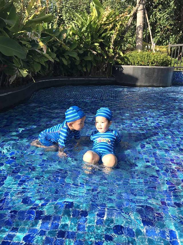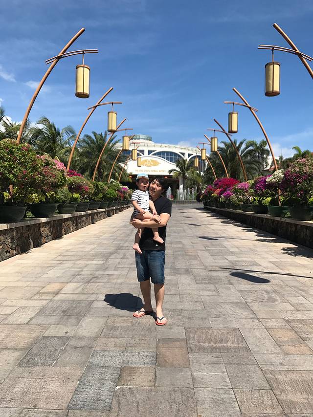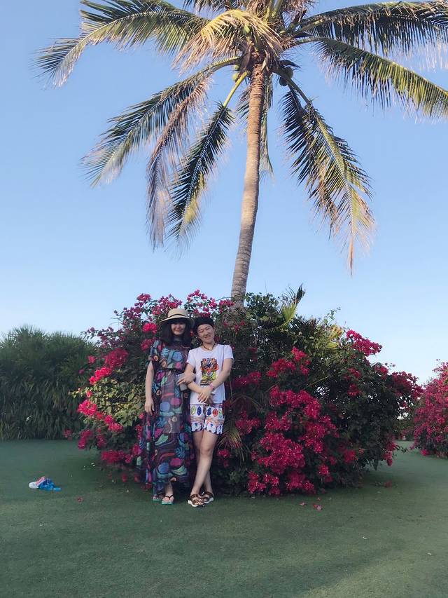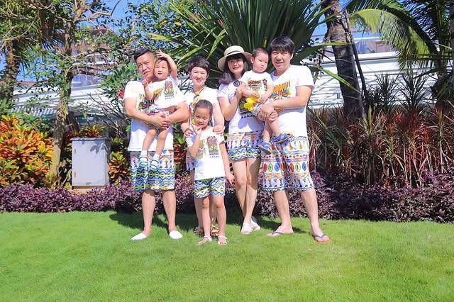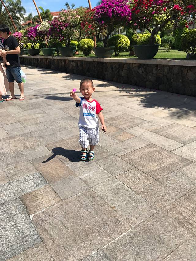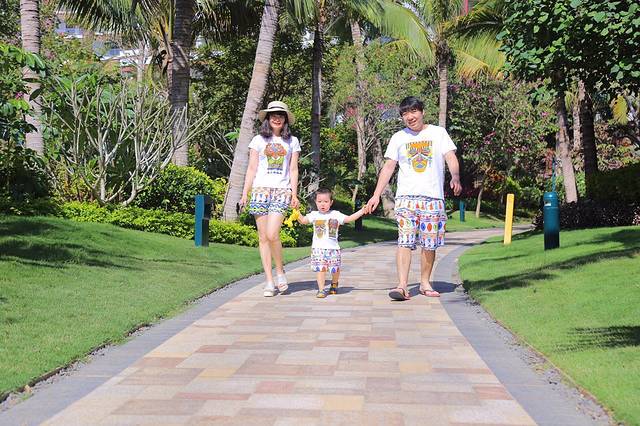 早晨起来,阳光明媚,晴空万里,果断给第一天在沙滩上遇到的跟拍小伙儿打电话预约九点半拍照。早早地换上亲子装收拾好叫着同伴一起下楼吃完早餐,摄影师已经在大堂等了,沿着酒店的庭院一路走一路拍,一直拍到沙滩,真的是处处是景色,而且看见照片的那一刻真是太后悔为什么没有把单反背来!手机像素简直被单反秒成了渣渣!太美了!最后三家一共拍了220多张,跟拍小伙说750元,我说600吧,正好我们一家200,小伙儿想了想,痛快的接受了。数据线连接马上穿到手机上来。