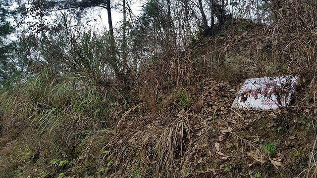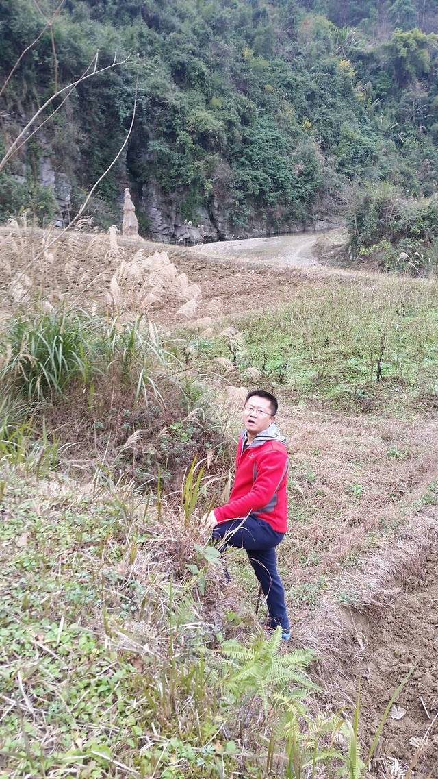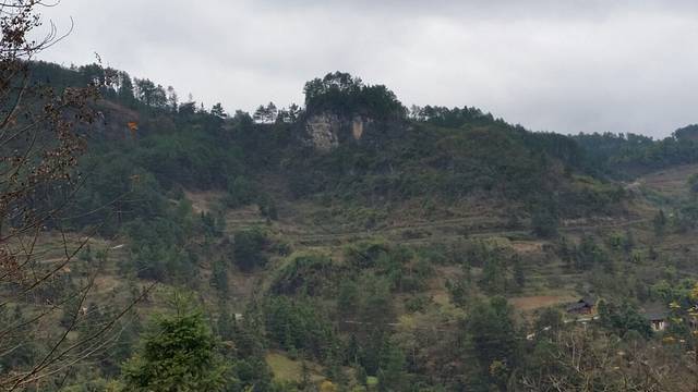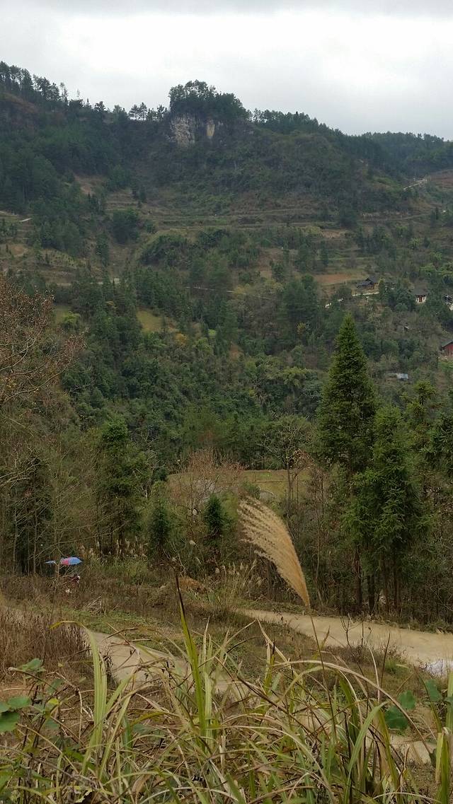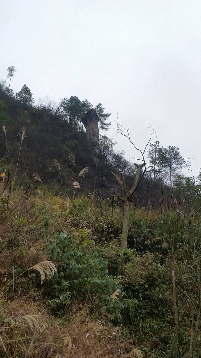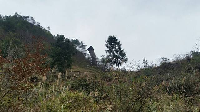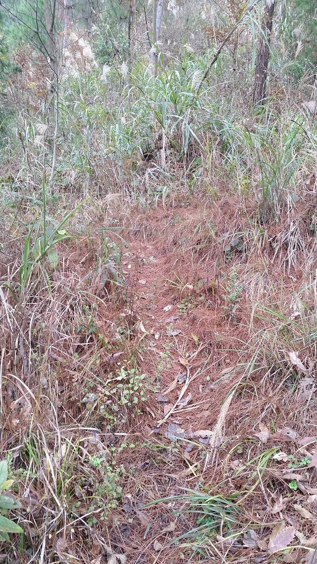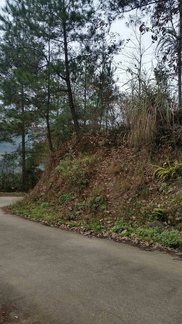 一路下坡,看见右侧的路边有一张(封山育林)的牌子,前方几米远有一条向右上山的小路,上去看看吧!