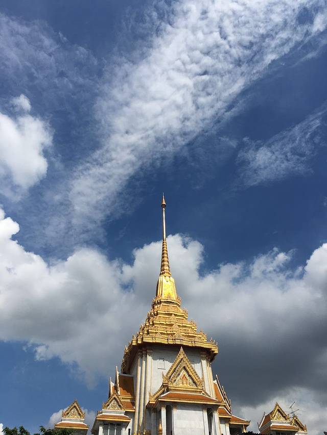 金佛寺在唐人街的尽头。我们按照导航找了半天,就在我们吃芒果捞感叹美味,天气又好抬头仰望天空的时候发现,金闪闪的庙宇就在马路对面,只是有些隐蔽,所以不太好发现。