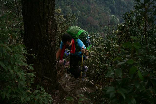 7:00am眾人收拾完畢開始撤離,下撤對比上山易,沿著山腰左兜右轉,橫移3小時多便已經回到上山前隔離村的山腳.