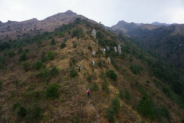剩下往上走的路已經沒有一開始的不斷陡了,有上有落的,繼續沿山脊走,林立的樹木逐漸沒有.看著團友登山的表情,登山的毅力,開心極了.