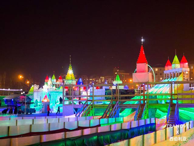 冰上乐园装饰地像一座城堡,晚上就会灯光闪烁,冰滑梯在灯光下也会呈现不同的颜色,非常漂亮。
