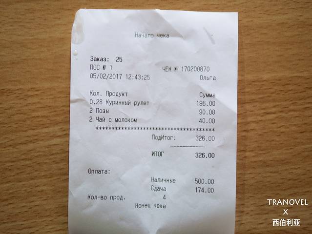 一般来说,两个人在伊尔库茨克市内吃一顿俄餐大概400~600卢布。在奥尔洪岛上吃一顿俄餐大概500~800卢布。我们在这附近呆了12天,吃饭上一共花费7730卢布。