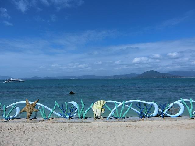 其实说起海三亚湾的是最没有特色的,和任何海滨公园没有多大区别,但是它近机场和高铁站,附近很多小吃和商店。说好的第二天出发去西岛的,没想到我们晚起了,就在附近的海滩逛一下,去三亚最出名的第一市场买买买,吃吃吃。你可以去第一市场逛逛水果摊,距离三亚湾近的还有一个大东海,大东海的海滩比三亚湾的清,我们一路上都留意到酒吧,别具风格的,如果你不喜欢步行,可以选择搭公交车,基本三亚湾的海边公交线路都在一条线的,我们住在三亚湾,只要往海边走,公交站上的线路都可以去到各大景点商场的。