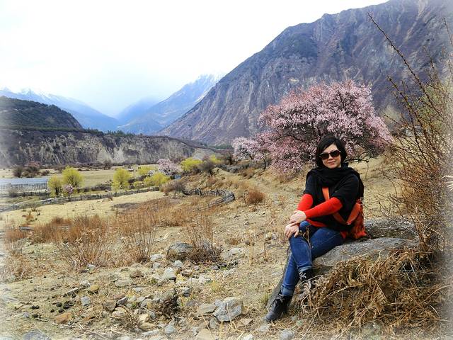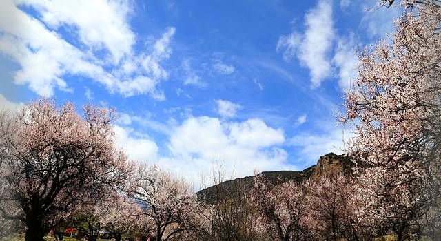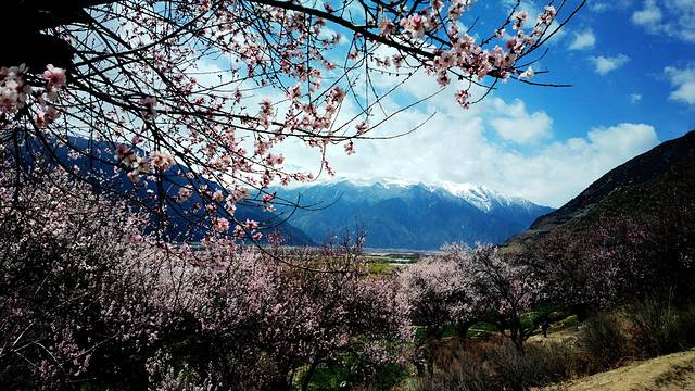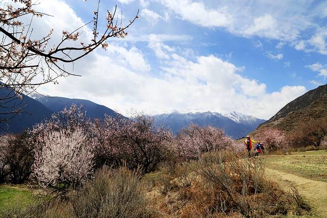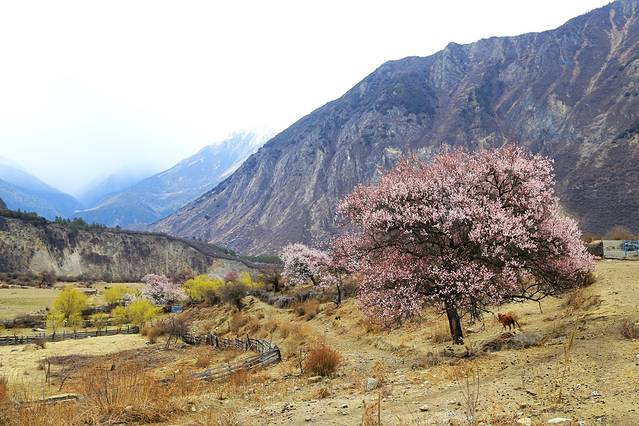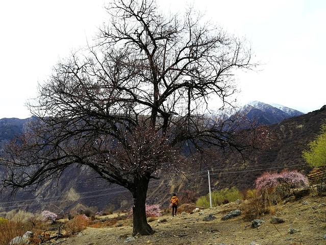 村后有云朵般的桃林,,悠然散步的藏香猪和轻松跑过的马儿,悠蓝透亮的天和雪山…,在静谧悠然的春日里,与我一块的,是同车的一对小情侣,我们没有搭话,但他们的存在让我心安,我想他们也一样感同身受。
