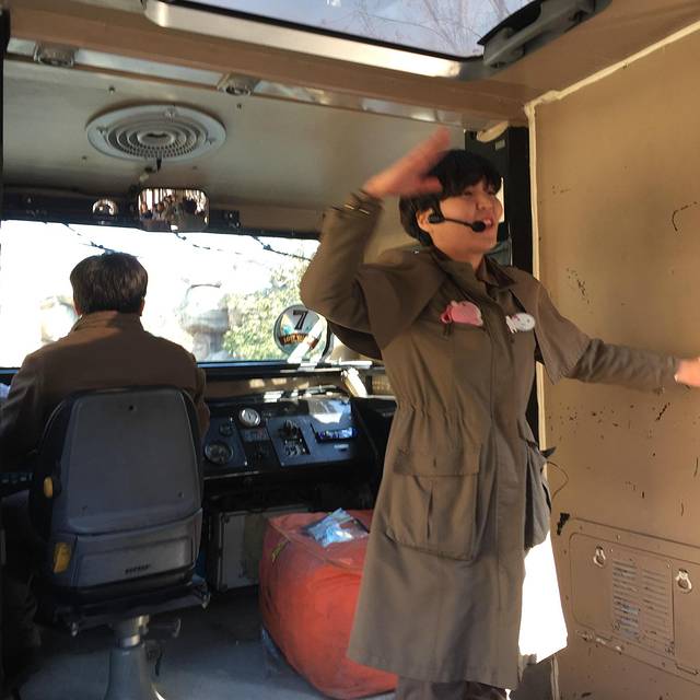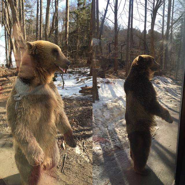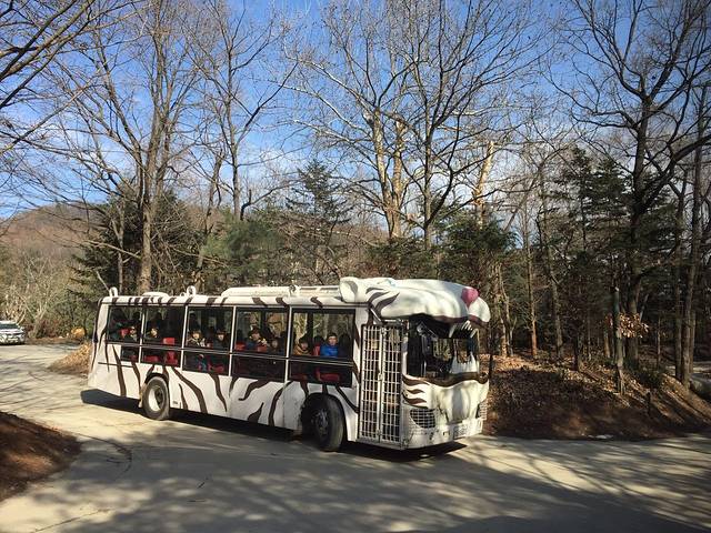 准备出发后,车子松了几下,又停下来了。熊站起来连续走了一路。司机哥哥笑着解释说:承诺给熊的五颗爆米花,只给了四颗。我们整车游客都开心地笑了起来。接下来一组是coco和kevi组合,据说kevi是熊们中最有礼貌的,它双爪接住爆米花(在韩国晚辈接受长辈饭桌上的酒或食物需要双手,这是礼仪),用一个漂亮的姿势接住,还鞠躬道谢。另一组熊被帅哥调戏,啵啵,再啵啵一个。然后我们就看着一只肿肿的大熊伸长脖子,做个标准的噘嘴表情,还不停地调整转头,眼中闪动痴汉的风情,真叫个迷醉啊。