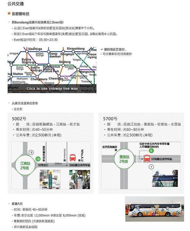 我们先坐地铁到的江南站,10号出口出来后直走乘坐5002爱宝乐园直达巴士!一小时左右的车程后,我们来到了距首尔市40km的everland(爱宝乐园)。摆渡车就在大巴站前50m处非常方便,免费带你到爱宝乐园买票处,工作人员服务到位,基础设施齐备。