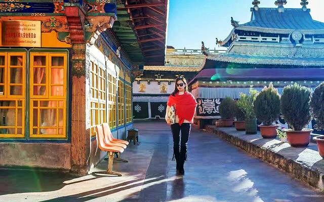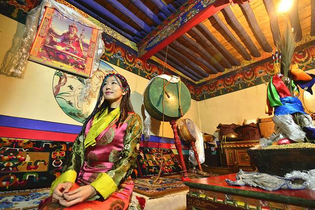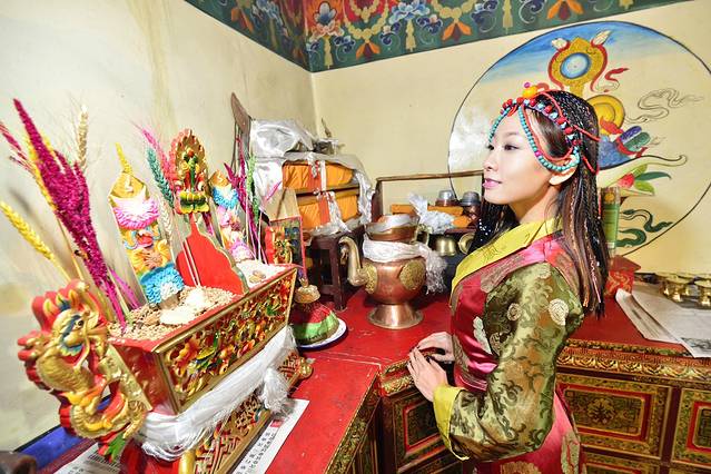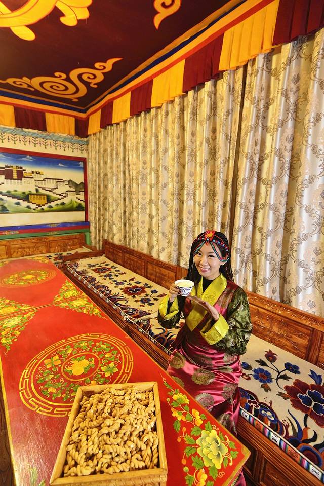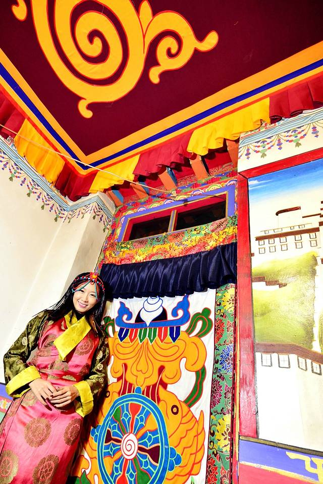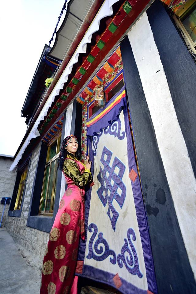 德吉介绍,旺季能在家里体验正宗藏餐,但需要提前一天预订(因为要准备食材);晚上要是住在这儿,还能在院子里开篝火晚会、看星空、载歌载舞……多么精彩的民宿体验,可惜我们今天只能错过。正失望着,她说:“还可以试穿藏服。”“叮~”我的玩乐神经瞬间被激活,敏锐地察觉到好戏要上演了。看着我发亮的双眼,德吉笑着推出了满满一架子藏服,并为我挑选了套颜色极为雅致的“贵族”服饰。没想到这几天一直苦寻不获的传统藏服,竟在这儿批戴上,简直是太大的惊喜。据说这套服装乃真丝编织,造价不菲,是藏区贵族节日所穿。