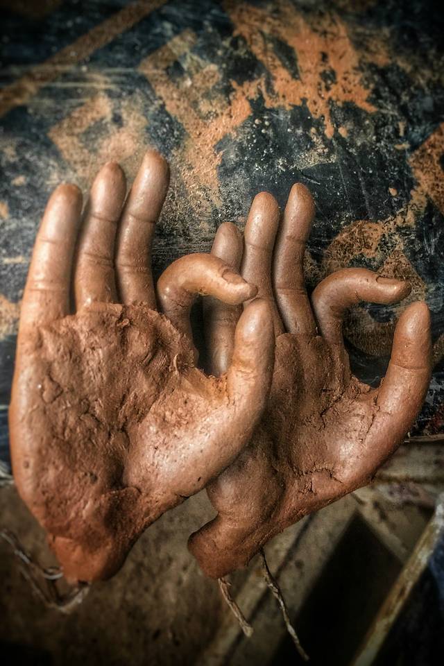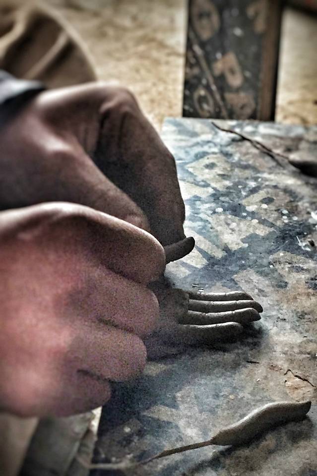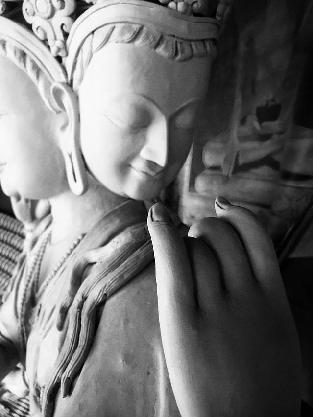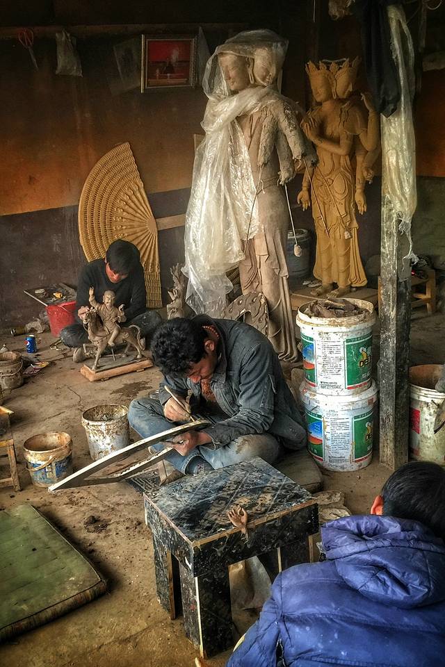 展览馆旁有个工棚,几位工匠正在制作佛像。这儿看起来非常简陋杂乱,但据说他们都是远近闻名的手工艺人。就看看这巧夺天工的佛手,是不是妙极了?