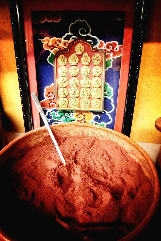 佛像、擦擦、各式纪念品等,均系用当地红土、藏萱纸、狼毒草、柏树粉、藏药、伊措圣水等材料手工捏制而成,防腐朽、易保存,具有一定收藏价值。