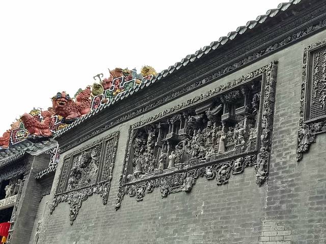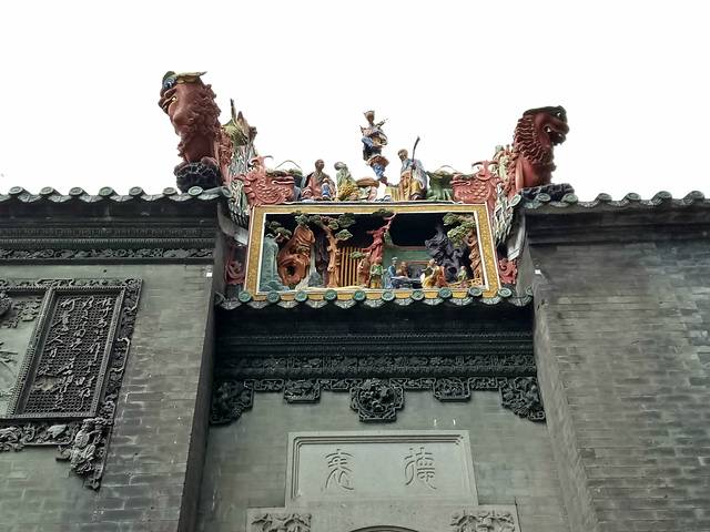 从黄埔归来已是下午,外面下着雨,有些凉,此时来陈家祠逛,却是再好不过的选择,因为这里满是回廊。一直很后悔曾经在平遥古镇,没注意领会晋中雕刻的寓意。此时,20元租一个讲解器,慢慢地欣赏那些砖雕、木刻,聆听艺术背后的故事,感受一下世族的底蕴与熏陶。