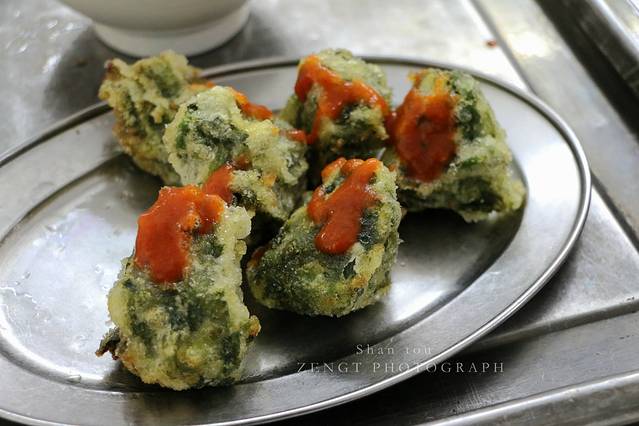 蚝炸,鳝炸,鱿鱼炸,电城一绝:炸。就是用面粉裹住海鲜馅料炸制而成的饼。